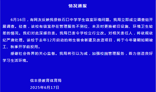 6月16日,有网友反映我县铁石口中学学生寝室环境问题。我局立即成立调查组开展调查。经查,该校有寝室存在管理服务不到位、未及时更换破旧设施、环境卫生较差的情况。我们对此深感自责。我局已责令学校立行立改。对相关责任人,将依规依纪严肃处理。该校于去年12月启动的师生宿舍新建及改造项目,将于今年暑期如期竣工、秋季开学前投用。